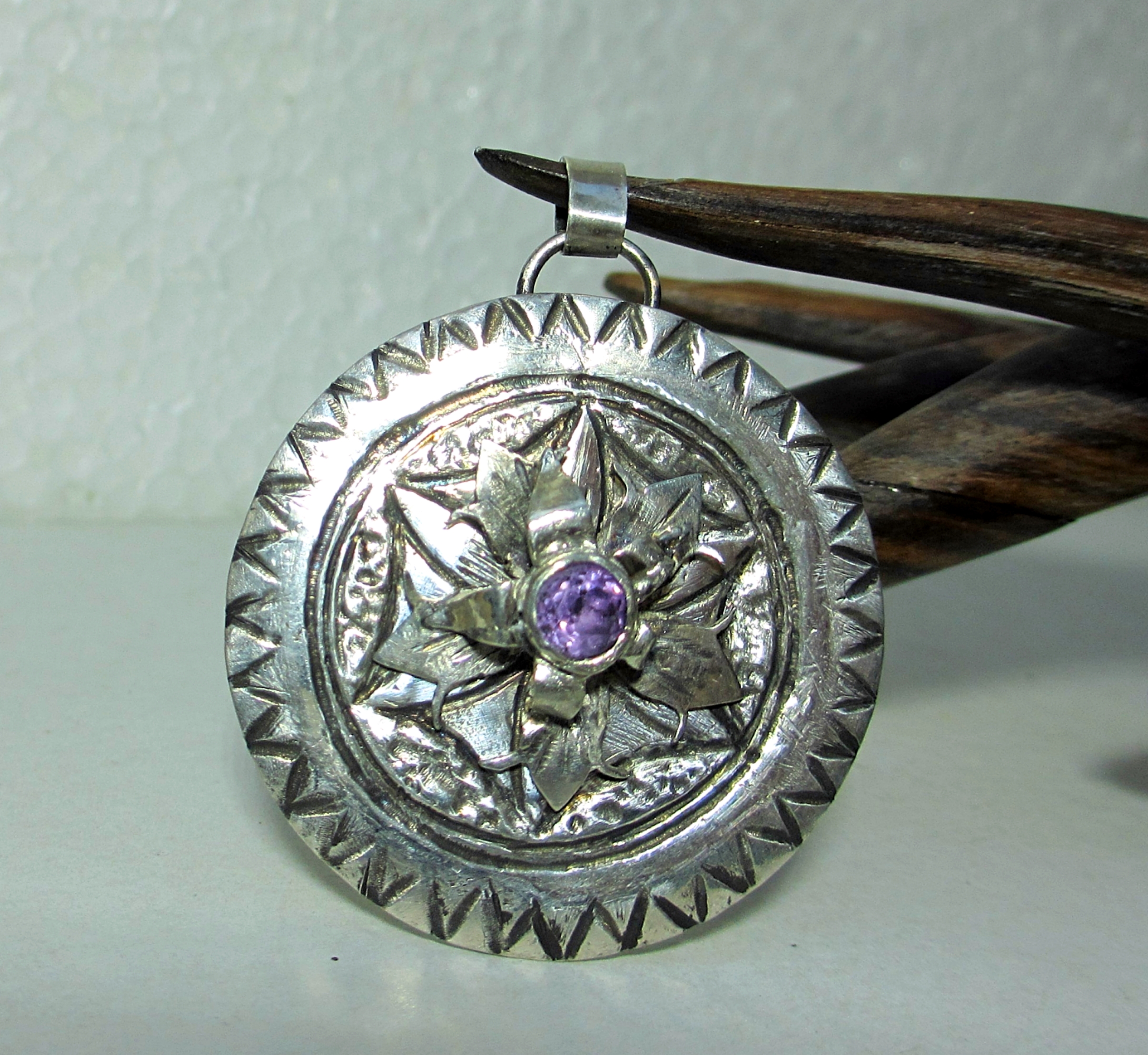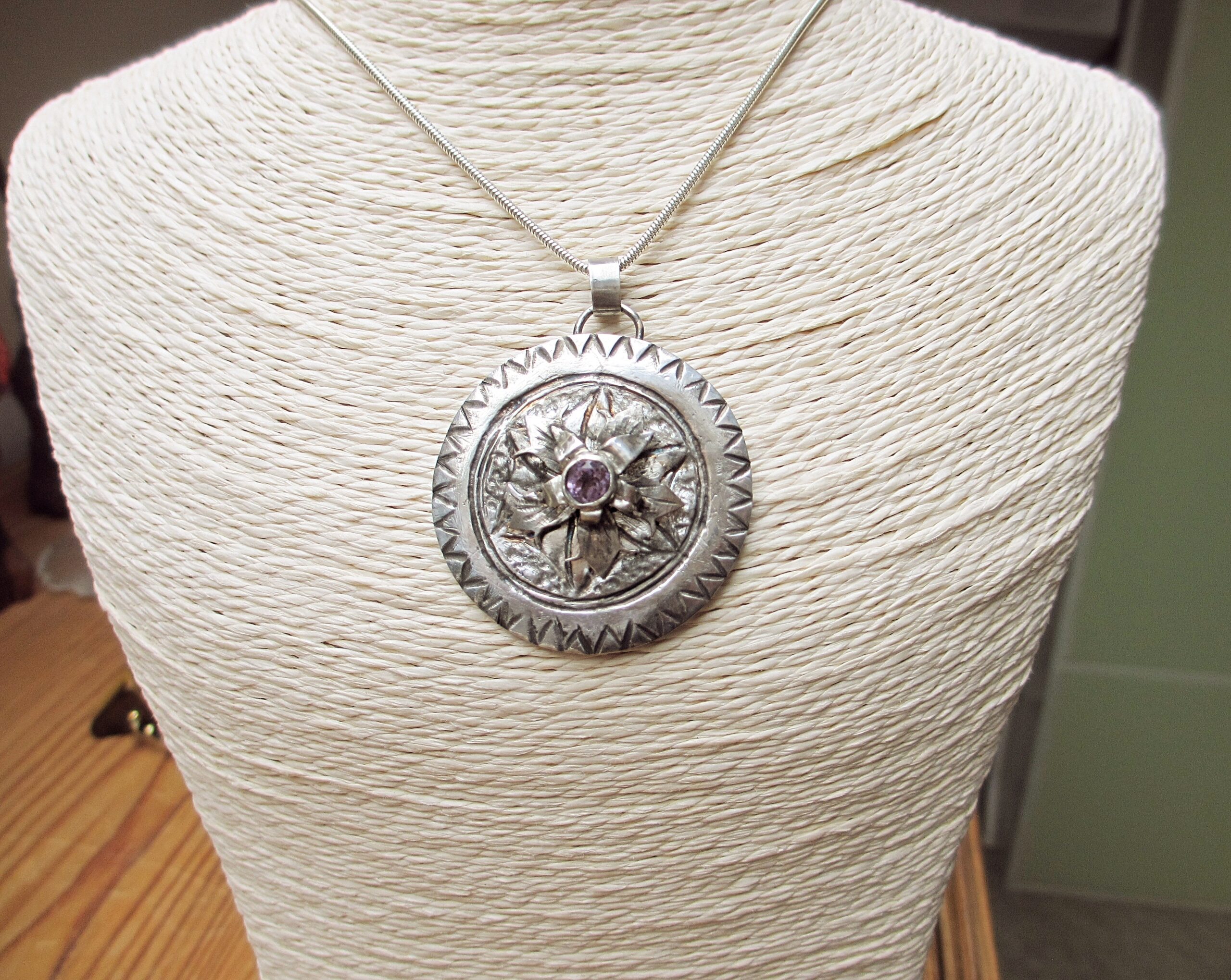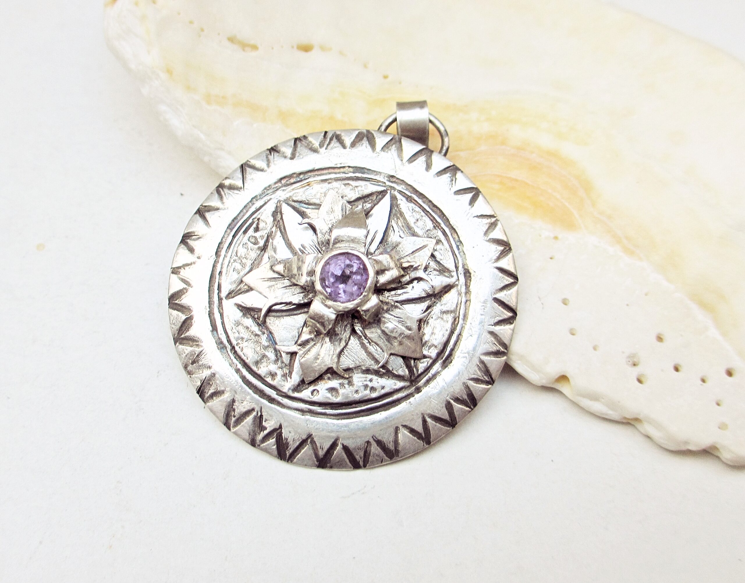 Flower medaillon pendant silver 999 and 925, amethyst