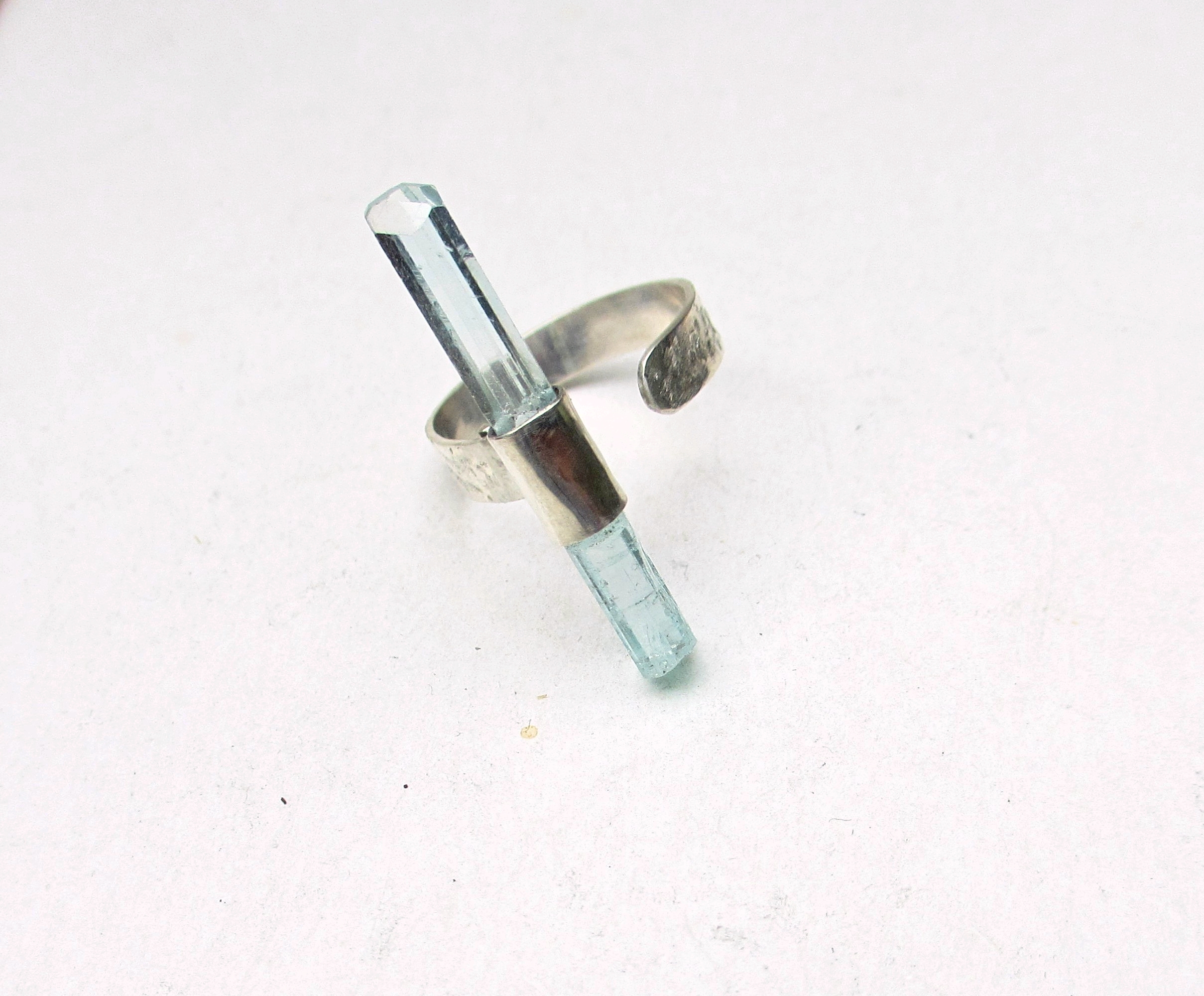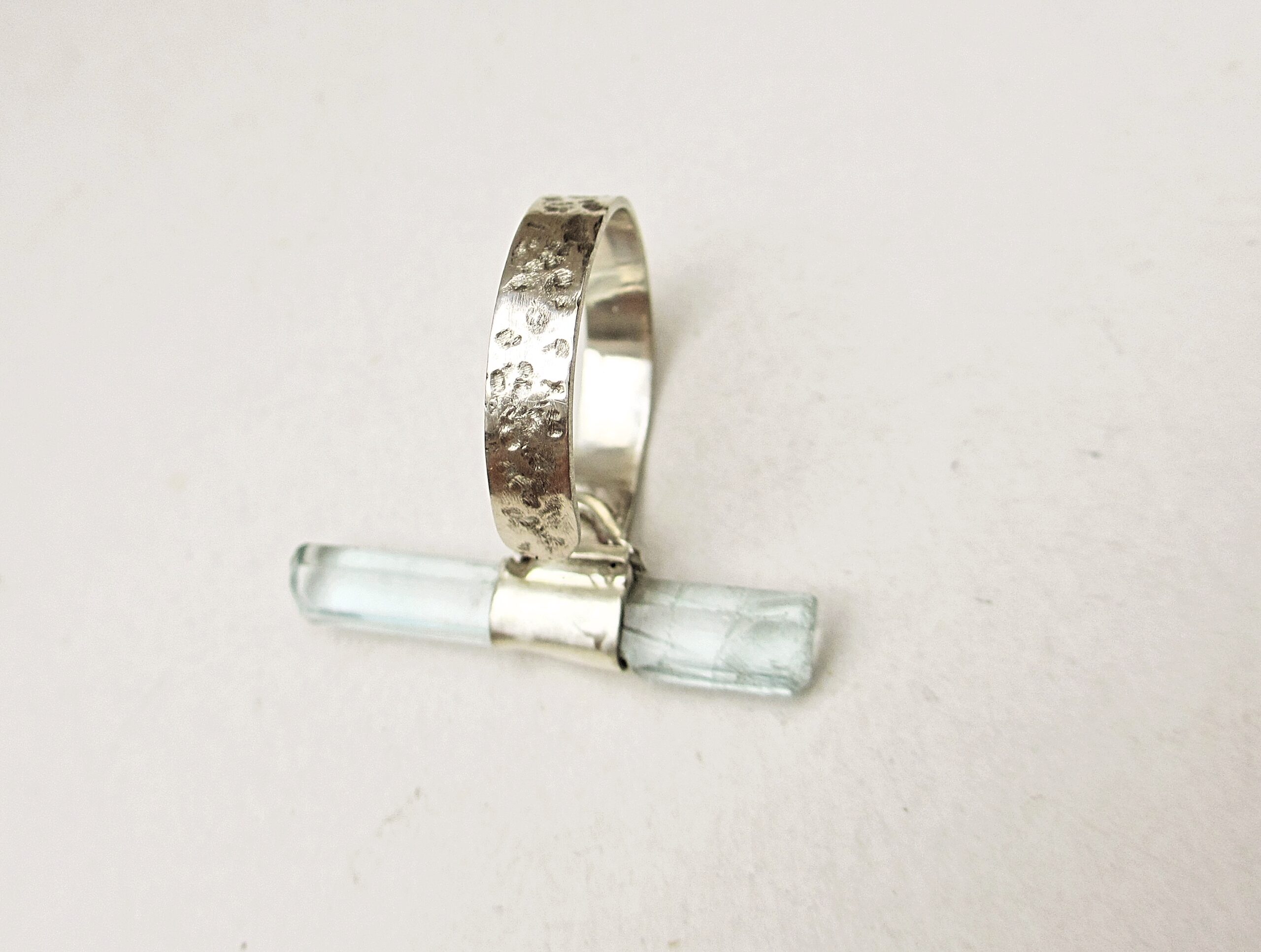 Raw Aquamarine Bar Crystal Ring, wide flat adjustable band of sterlig silver in sizes from 16 to 21 EU (6 – 12 US)