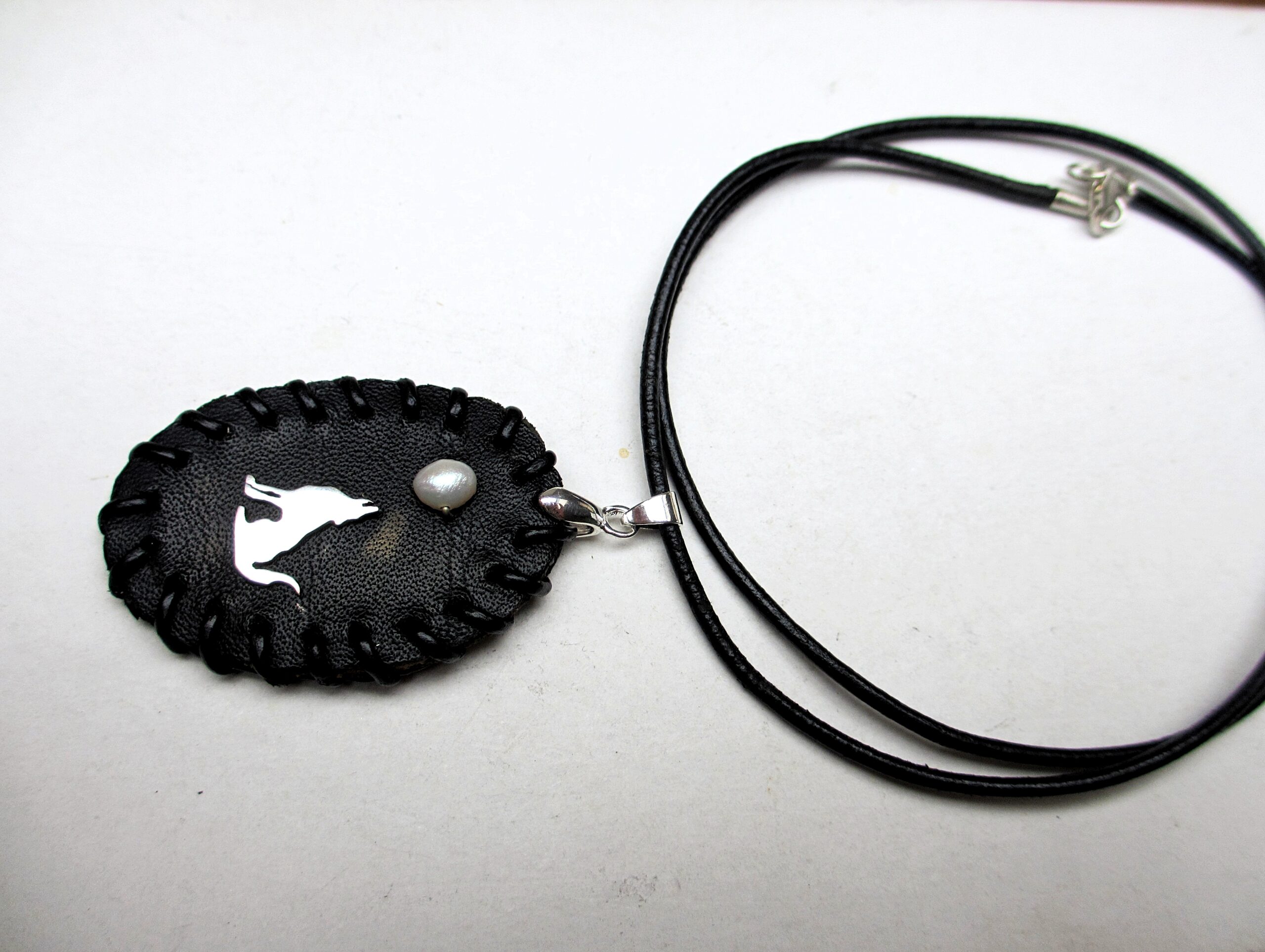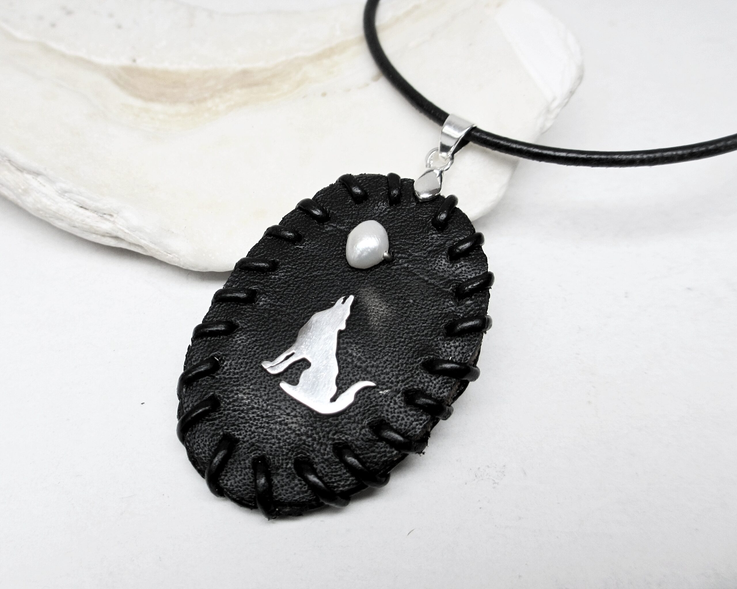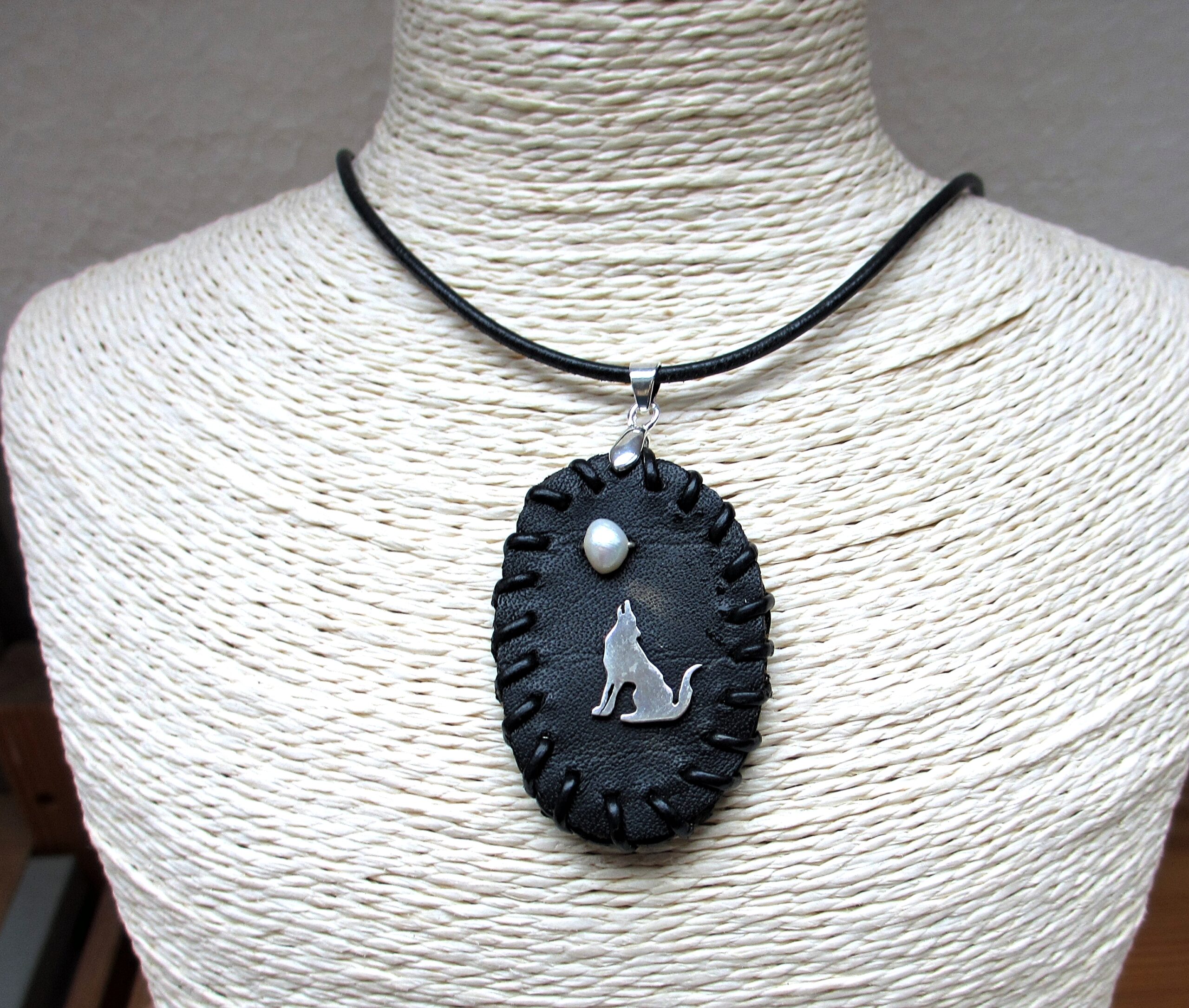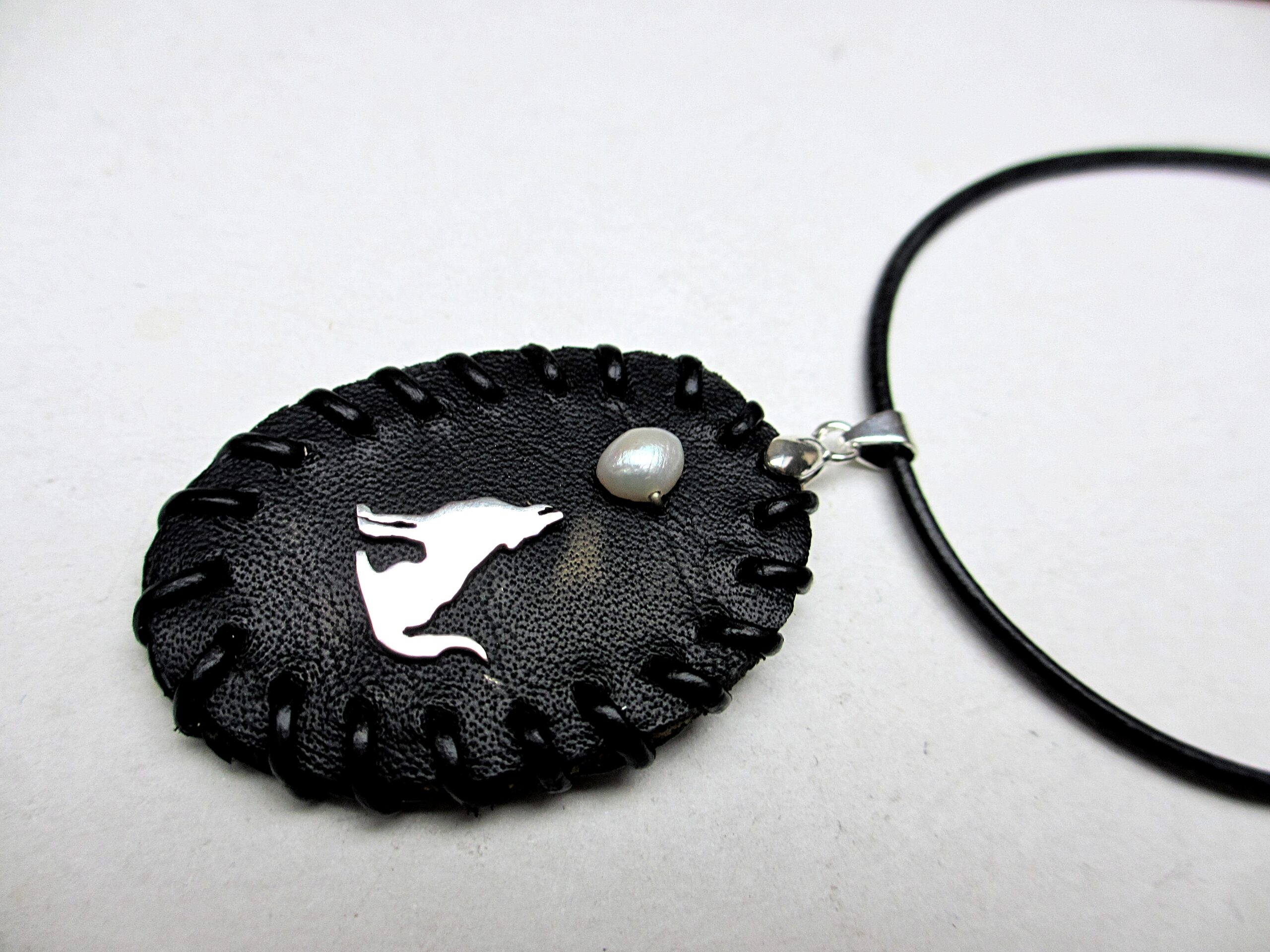 A 2×1 cm figure of a howling wolf has been cut from a sterling silver sheet. The wolf has been fastened with soldered sterling pins onto an oval piece of leather (4 mm thick), together with a 0.5 cm genuine freshwater pearl symbolizing the (almost full) moon.