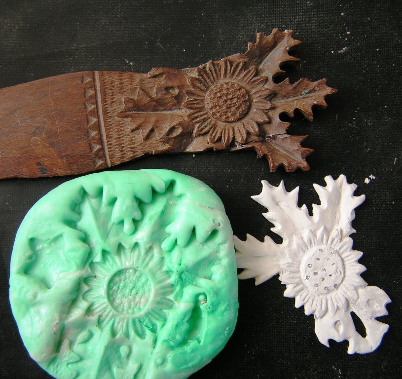 The most magical feature of silver clay is the possibility to make silver clay molds of nearly everything: from living flowers to artifacts made long ago by our ancestors. I have inherited from my great-grandmother some antique wood carvings, among others a couple of napkin rings and a wooden bookmark. To my opinion they are too beautiful to be used for their primary purpose or to be kept in a drawer as a collectors item. So I decided to promote them to jewelry by embossing them in silver clay.